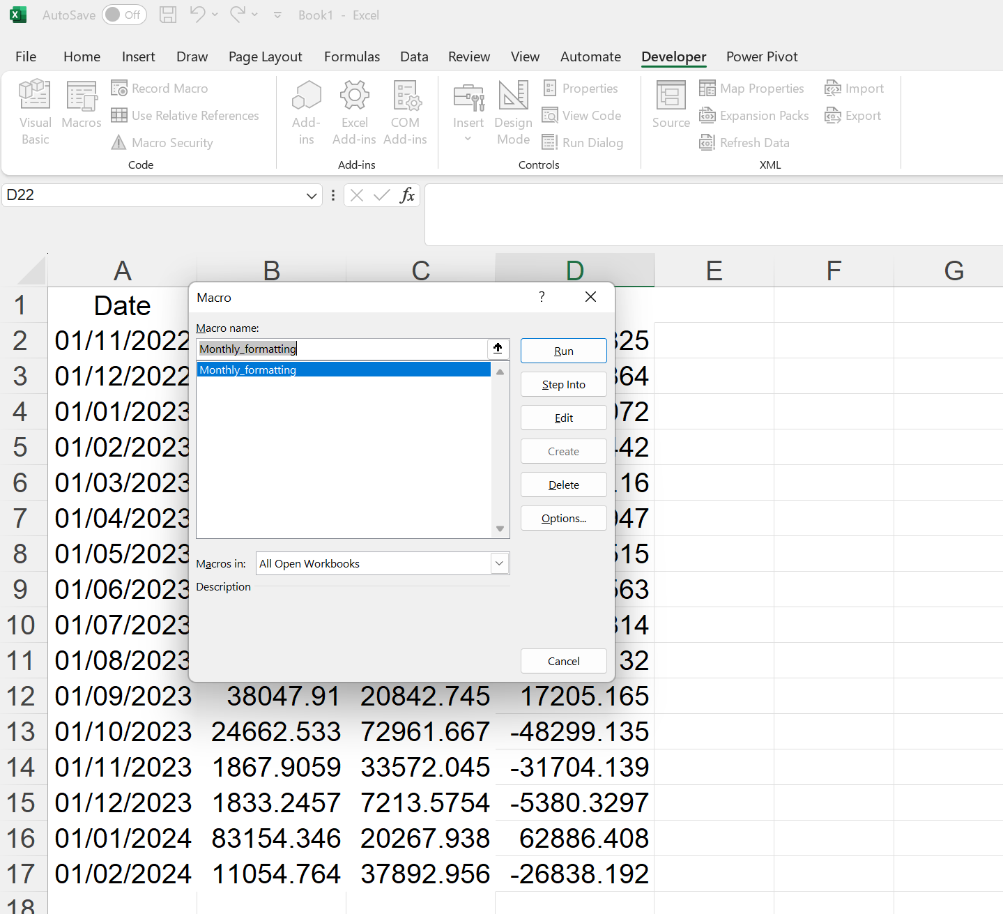 Go to the ‘Developer’ tab ➡️ Click on ‘Macros’ ➡️ Select the macro you want ➡️ hit ‘Run’