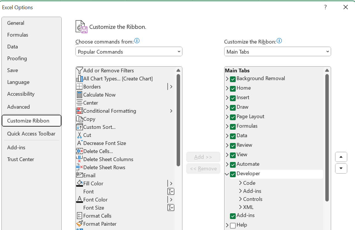 First off you will need to ensure you enable the ‘developer’ tab in your Excel Ribbon. To do this go to File ➡️ Options ➡️Customise Ribbon ➡️ Ensure ‘Developer’ is ticked on the right-hand side ➡️ Hit OK