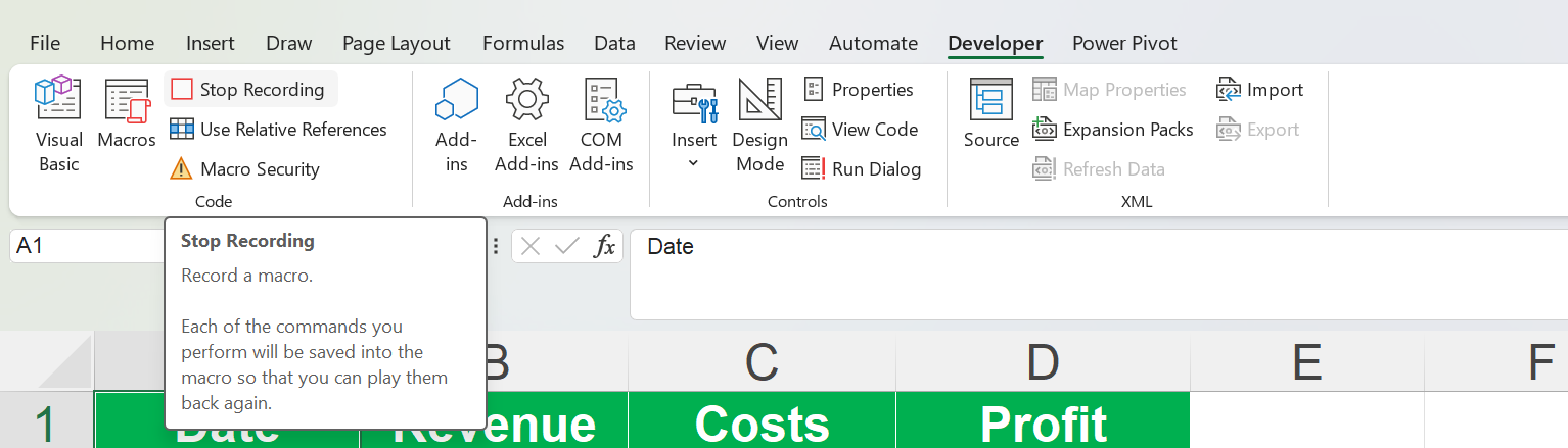 Once you’ve finished your formatting go back to the ‘Developer’ tab and click Stop Recording