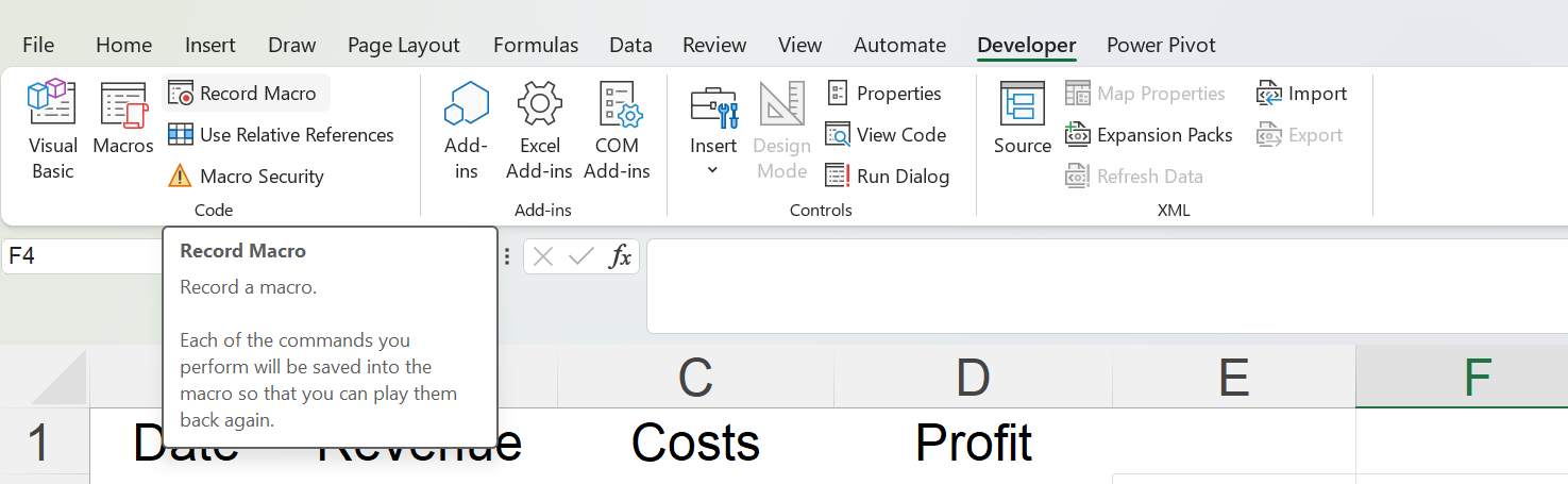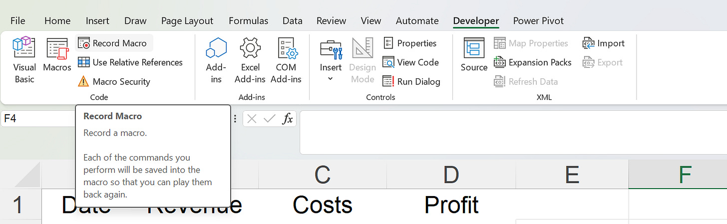 Next, you need to go over to the ‘Developer’ tab in the ribbon and click Record Macro.